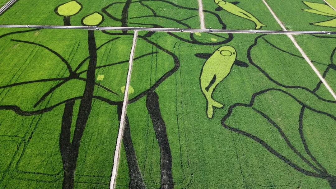 設計思路:稻田畫位于杭州西湖西側,因而取荷花與鯉魚的西湖特色元素,據漢樂府詩《江南可采蓮》描述的意境,通過彩色水稻藝術化的創作了這副《魚戲蓮葉圖》?!遏~戲蓮葉圖》的圖畫中,一對鯉魚像夫妻一樣向上游,逆流而上;兩朵開花的荷花和兩朵未開花的荷包,兩條大鯉魚和六片荷葉,成雙成對的水滴,每一環節的設計都有“偶”意,荷花與鯉魚同時象征著連年有余、和和美美的吉祥寓意。“雙花雙蕾雙葉雙魚游,人文人藝人美人心齊。雙浦雙成,人文人才?!?,稻田畫用中國傳統水墨畫的方式,彩稻為墨、田為紙,將農業園藝化,大地藝術化。